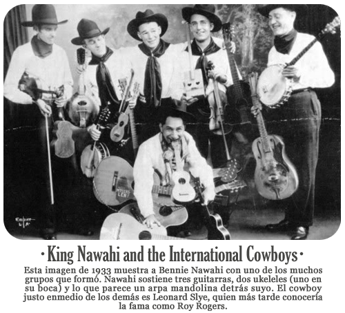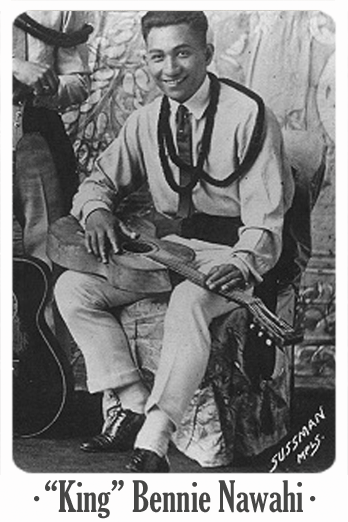 “King” Bennie Nawahi, como fue apodado Benjamin Keakahiawa Nawahi, es junto a Hoopii el más famoso guitarrista hawaiiano. De hecho ambos competían en la época por el título de “rey de la guitarra”, aunque suponiendo que ambos habían tocado juntos en sus inicios esa supuesta rivalidad tendría más de fines publicitarios que de realidad. Nawahi empezó de manera parecida, tocando en los parques para luego tocar en barcos y pasar de ahí al circuito americano junto a su hermano, estableciéndose en San Francisco. Nawahi se hizo rápidamente con un nombre en los espectáculos de vodevil, donde asombraba a todos tocando la guitarra con sus pies o con su increíble y vertiginosa técnica al ukelele (hay varias grabaciones que lo demuestran), por lo que el empresario Sid Grauman le bautizó como “el rey del ukelele”, apodo del que Nawahi haría ostentación a lo largo de su carrera acortándolo a simplemente “rey”.