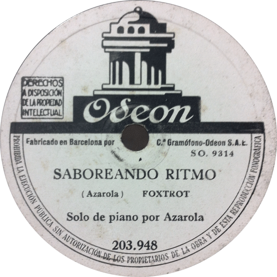 Pero como siempre, reivindiquemos su figura con un poco de música. No hace mucho cayó en mis manos un buena copia de otro de sus discos en el que se incluye esta pequeña joya, «Saboreando ritmo». Si bien la Biblioteca Nacional Hispánica lo data en 1943 a menudo sus catalogaciones contienen muchos errores, y de la misma manera que pasa con «Dulce Sue» podría ser algo anterior. Por la etiqueta del disco, en blanco y negro, sabemos que fue editado durante la Segunda Guerra Mundial (por la falta de recursos muchas casas editaron sellos en simple blanco y negro). Sea como sea, ahí va el tema. Espero que la entrada sirva para conocer un poco más la figura de este pianista, uno de los grandes precursores del Jazz en España. Os dejo con el tema no sin antes agradecer enormemente la ayuda de Antonio Berberana. Espero que lo disfruten.