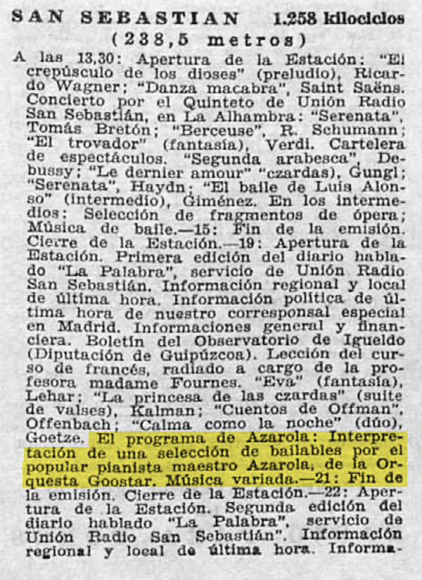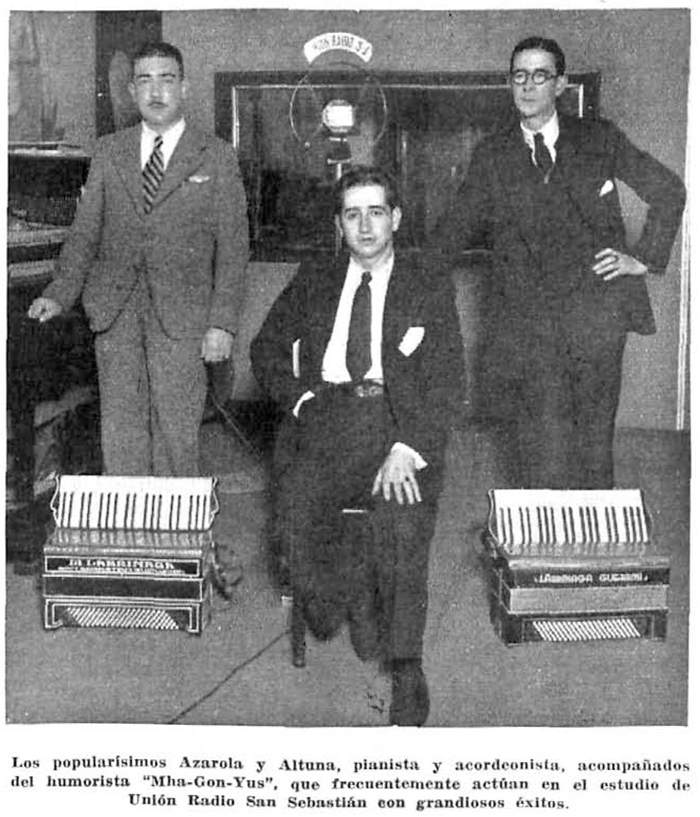 No disponemos más que fragmentos de los inicios profesionales de Azarola en la música, si bien podemos asegurar que en algún momento hacia finales de los años 20 estuvo trabajando como pianista acompañante de películas mudas en el Teatro Gorriti, de Tortosa, trabajo que dejó con la llegada del cine sonoro, tal y como me explica el compañero Antonio Berberana había comentado gente que le rodearon. Es de suponer que este trabajo seguramente fuera anterior a 1930, ya que en ese año se encuentra viviendo en San Sebastián, como muestra el Anuario Musical de España editado en Barcelona en 1930, donde se le nombra como profesor de piano en la provincia de Guipúzcoa, estableciendo su residencia en el nº 33 de la calle Fermín Calbetón (ver aquí el enlace de la Hemeroteca Digital de la Biblioteca de España). Es también en la capital de Guipúzcoa donde se le conoce su primer trabajo de repercusión mediática unos años más tarde. Tal y como podemos leer en la revista Ondas, Azarola trabaja en la radio de San Sebastián por lo menos entre Diciembre de 1934 hasta al menos Noviembre de 1935, donde tiene su propio programa, «El programa de Azarola», tocando él sólo el piano con números de Jazz y temas clásicos. Es en esa misma revista donde también vemos por primera vez el nombre de una de las orquesta donde tocaba en la época, la enigmática Orquesta Goostar, así como una foto de un treintañero Azarola en los estudios de la radio acompañado por dos estrellas más del momento.
