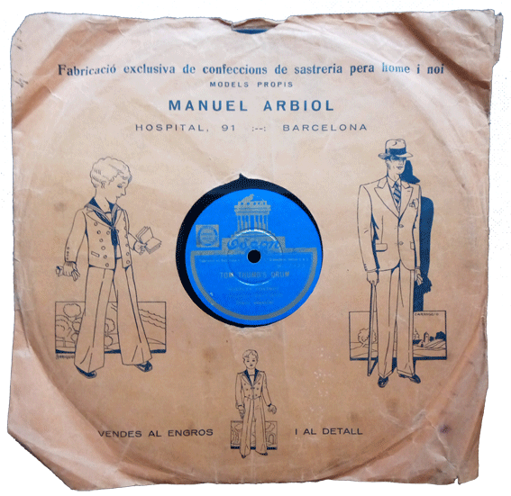 Es por eso que cada vez que encuentro alguno (que no ocurre muy a menudo) es motivo de emoción, sobretodo si se trata de algo tan raro y especial como el disco que hoy presentamos. Hace poco hurgando entre varios discos de otro colecionista vi un Odeon de la Orquesta Crazy Boys con un tema de Jazz en una cara y en cuya etiqueta se leía en ambos lados: «Impresión particular/Disco especial». No tenía número de serie en la etiqueta, aunque luego inspeccionando la parte de cera muerta del disco se podía leer el número 183.529, por lo que deduzco que debe ser de 1932. Cuando lo pinché en casa quedé atrapado por su versión de «Tom Thumb’s drum», un número estupendo con un fragmento de scat, buenos solos de clarinete, banjo y saxofón. ¡Mejor que algunas de las versiones que he oído del mismo tema! La otra cara era más misteriosa: Alguien había rascado el título pero lo que oía era algo totalmente diferente, una cancioncilla en catalán bastante floja y nada jazzy sobre trajes, con voces de niños alabando lo bien que vestían. ¿Qué diablos era eso? Estaba claro que esa cara era un encargo y que la banda (o la compañía) incluyó un número de Jazz por poner algo. ¿Pero qué tipo de encargo era? ¿Quizá una promoción encargada por la propia banda? Muchas en la época vendían sus propios discos en directo con prensajes particulares de corta tirada. ¿Quizá era un encargo de algún particular? En ese caso, ¿quién?