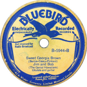 No tengo las cifras de ventas, pero imagino que no fueron muchas, ya que sus discos son de entre los más buscados entre los fans del género (no quiero ni decir lo que he tenido que pagar por alguno). El que hoy os presento es, de hecho, uno de los más raros de los 6, el Bluebird B-5944, que en su cara B incluye el único tema en el que Bob dejó aparte su guitarra hawaiana y ejecutó uno de los solos de ukelele más impresionantes jamás grabados. Más adelante puede que comparta alguna de sus otras joyas, pero he creído conveniente escoger uno de sus temas más oscuros, aunque también de mis favoritos; Nada más y nada menos que una frenética versión en ukelele del clásico del Jazz «Sweet Georgia Brown» llena de maestría y de una técnica impresionante. Espero y creo, que después de oírla, cualquiera verá al pequeño instrumento de otra manera. Como siempre, digitalizado de mi colección. Espero que lo disfruten.