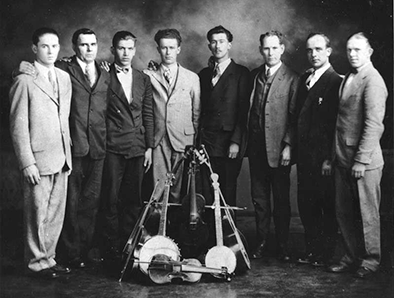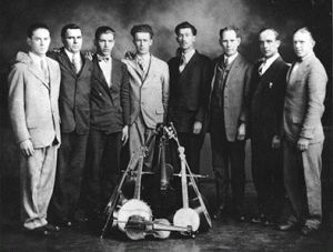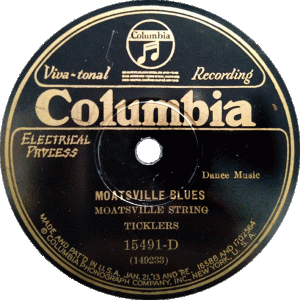 Se grabaron a un buen número de artistas en 1928, así que justo un año despues, en octubre de 1929, Walker volvió a Johnson y siguió con su tarea. Es durante esta segunda sesión que se grabó el único disco editado de la banda que hoy nos ocupa, los Moatsville String Ticklers. Esta banda, oriunda de la ciudad de Moatsville, en Virginia del Oeste, constaba de ocho miembros que respondían a estos nombres siguiendo el orden de la fotografía de más arriba: (de pie) Zel Frey, Doyle Shaffer, Brooks Ritter, Floyd Frey y (sentados) Marshall Summers, Harold Ritter, Cecil Frey, and Gordon Frey. Cecil Frye (violinista) y Brooks Ritter (banjo y carpintero de profesión) eran los líderes del grupo que, aún a pesar de grabar 4 temas, sólo vio 2 editados en un único disco. ¿La cuestión? La maldita depresión que había estallado un mes antes con el Crack de la bolsa americana y que hundió las ventas de discos. Toda una verdadera pena, ya que no sólo se trata de uno de los primeros ejemplos de música del oeste de Virginia sino que la banda era realmente estupenda.