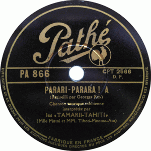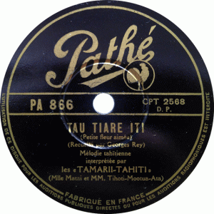 L’Ensemble Tahitien Tamarii Tahiti fueron un grupo de músicos que llegaron a Francia aprovechando seguramente este súbito interés por lo polinesio. Sus dos miembros principales fueron la cantante, ukelele y bailarina Mataiura Tarere a Moana, también conocida como Mademoiselle Matai, y el guitarrista Georges Thioti Rey, quienes llegaron a Francia via Marsella para establecerse en el famoso local de la Boule Blanche (del que ya hablamos en la entrada sobre la orquesta del local) en la Rue Blomet de París, donde actuaron durante un buen tiempo para más tarde llegar a grabar para el sello Pathé sus primeros 4 discos hacia 1935-36 (editados en 1936). A pesar de no ser los primeros de música tahitiana editados por el sello, estos maravillosos discos sirvieron para que miles de franceses se introdujeran por primera vez a la intoxicante y maravillosa música tradicional de la Polinesia, grabada con guitarras (también guitarra steel) ukelele, percusión e incluso harmónica en una de las caras. Puedo asegurar eso de “miles” ya que por fortuna son discos fáciles de encontrar (al menos en Francia), signo de que se vendieron bastantes copias, al contrario de sus siguientes discos editados bajo otro nombre más tarde que ya son mas difíciles de ver.