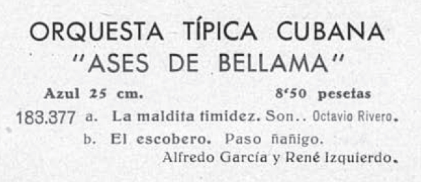 Fue un viernes por la tarde y recuerdo estar agachado, ensuciándome las rodillas y las manos (nadie dijo que la búsqueda de discos sea elegante) mientras inspeccionaba unas cuantas pizarras cuando el sello azul de Odeon me hizo deslizar mi vista para revisar los títulos de una tal «Orquesta Típica Cubana Ases de Bellama». Por el ridículo precio que pagué por el disco valía la pena arriesgarse. Así que en poco tiempo llegué a casa y después de una limpieza (propia y del disco) lo pinché y quedé maravillado. ¡Estupenda orquesta! Las dos caras eran preciosas: Por un lado una versión del son «La maldita timidez» (grabado anteriormente por el Sexteto Habanero) y por el otro un curioso paso ñáñigo (por entonces no tenía ni idea de qué significaba eso) titulado «El escobero». Compartí el disco con varios coleccionistas para ver si alguien había oído hablar de ese misterioso grupo. Nadie los conocía. Hace al menos 7 años de ese día pero recuerdo lanzarme a buscar datos desde esa tarde. Descubrí que la etiqueta contenía un error en el nombre, ya que se trataba de los Ases de Bellamar (alguien de la compañía Odeon se comió una R) pero apenas logré información sobre ellos. Eso fue hasta hace poco, cuando el gran coleccionista y estudioso de la música cubana Gino Curioso, me pasó unos cuantos recortes y eso trajo como resultado unos cuantos días frenéticos de buscar y recopilar información de distintos lugares. Gino ha sido el que me ha hecho moverme de mi vagancia y hacerme escribir finalmente sobre esta fugaz banda, una gran desconocida para muchos. Así que va por él.