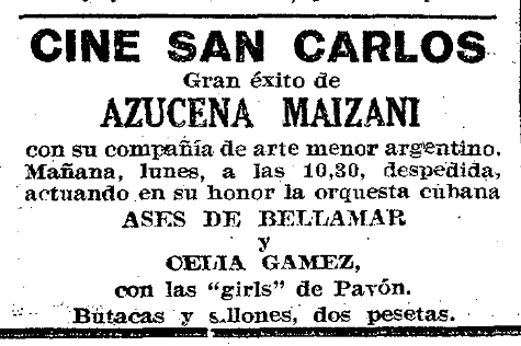 El rastro de los Ases de Bellamar se diluye a partir de aquí. La última mención de la banda que he encontrado es del 5 junio de 1932, cuando tocan en el cine San Carlos de Madrid en la despedida del espectáculo de Azucena Maizani. Nada más, pero al menos René no detiene su carrera.